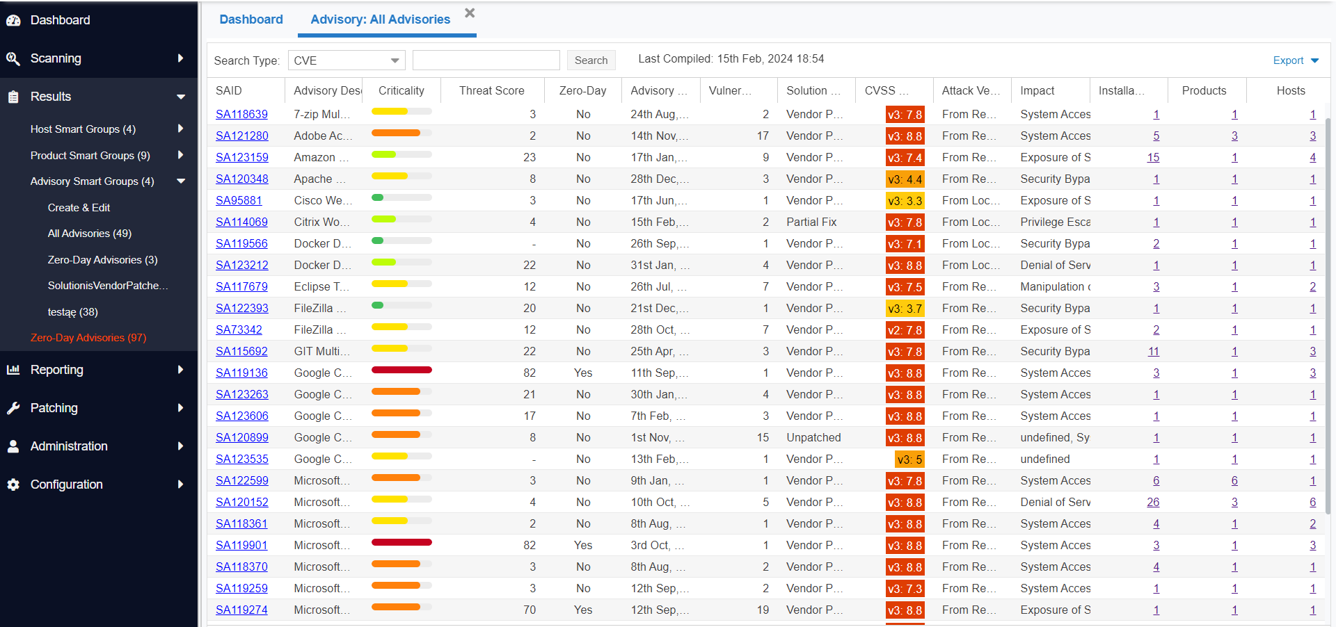 Software-Vulnerability-Manager--Cloud-Edition--Help-LibraryAppendix D - Threat IntelligenceThreat Score LocationsAll Advisory Threat ScoreAll Advisory Threat Score The Threat Score is made available in the All Advisories page.