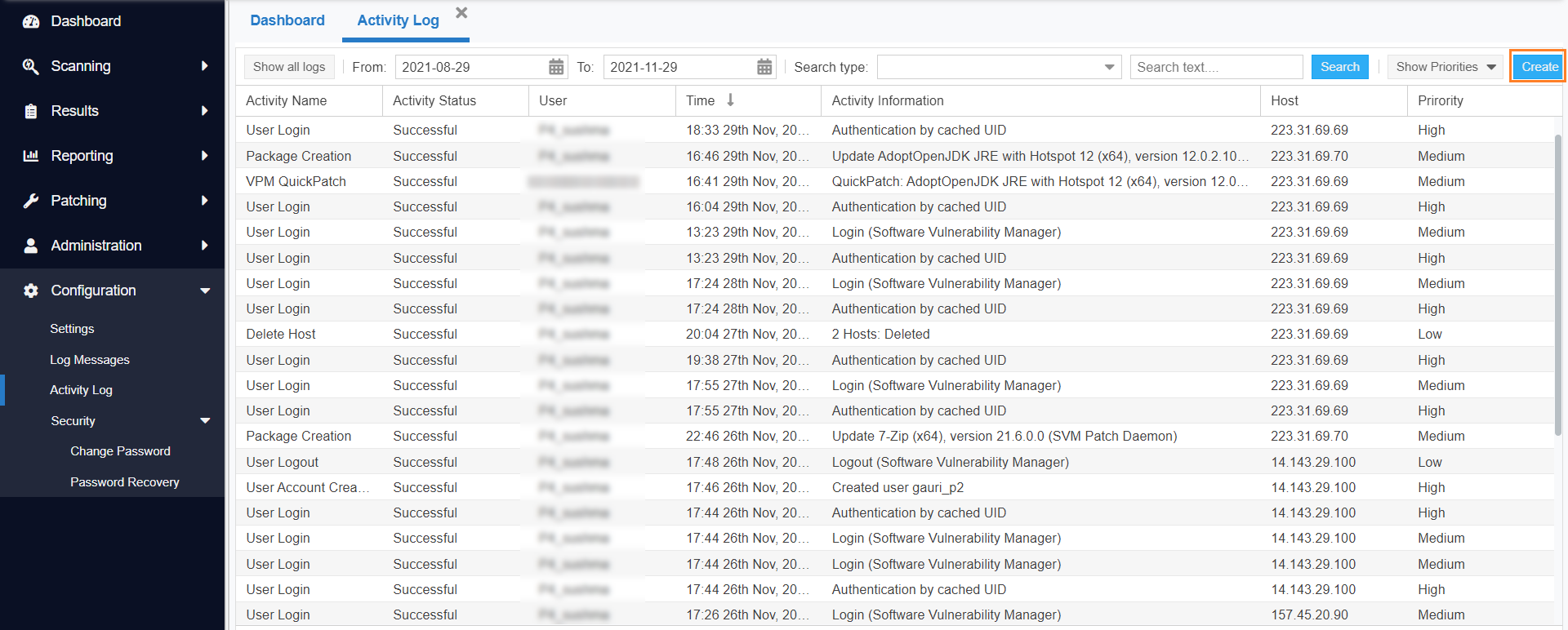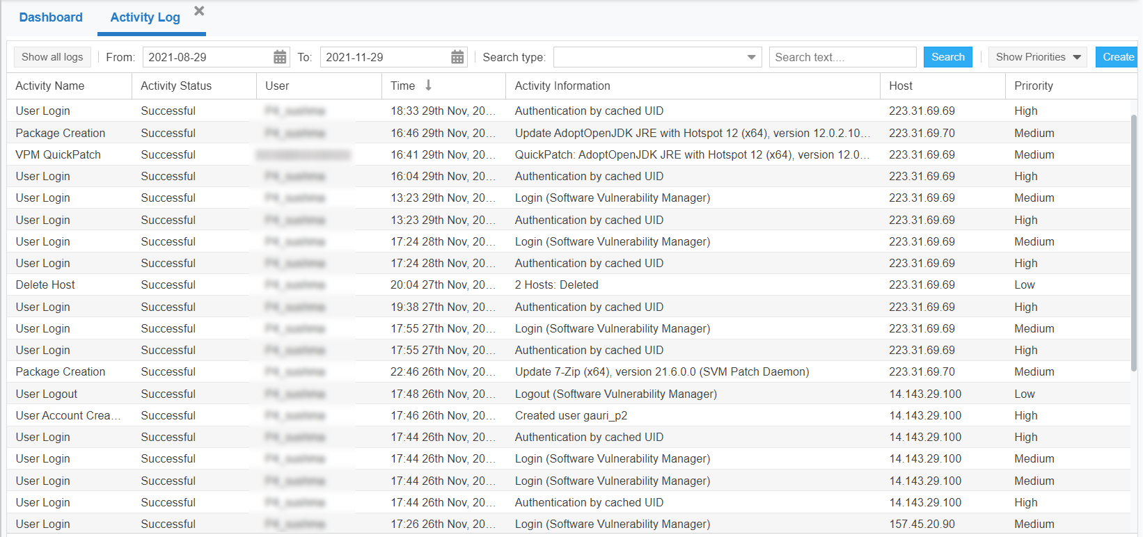 Use this page to view information about user activity within Software Vulnerability Manager, for example "write" actions, logins, and so on, with the exception of scans (due to the volume of data generated). You can access a full activity and login log for compliance monitoring and auditing purposes.