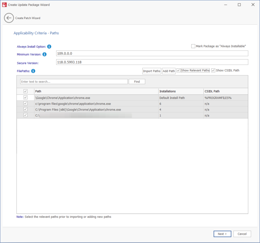 On Applicability Criteria - Paths panel, no action is required. If required, you can select the paths/locations to which this package should be applied.