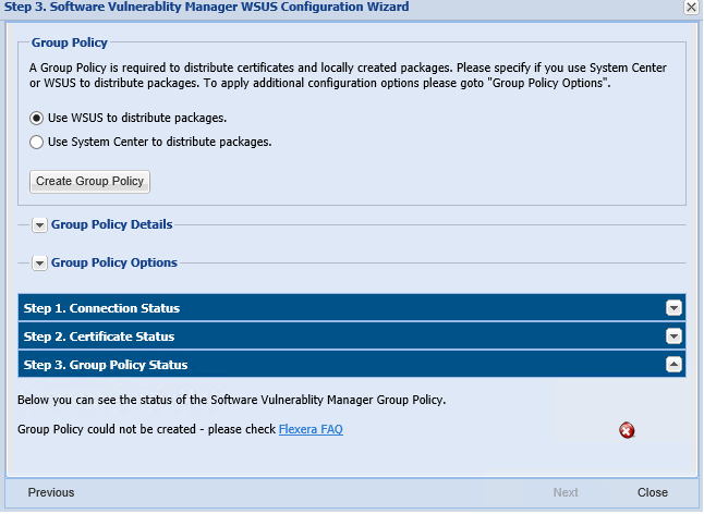A Group Policy is required to distribute certificates and locally created packages. Software Vulnerability Manager can easily create this GPO so the WSUS Signing Certificate is distributed to all clients. Please choose to use WSUS or System Center. Once this is completed expand the Group Policy Options.