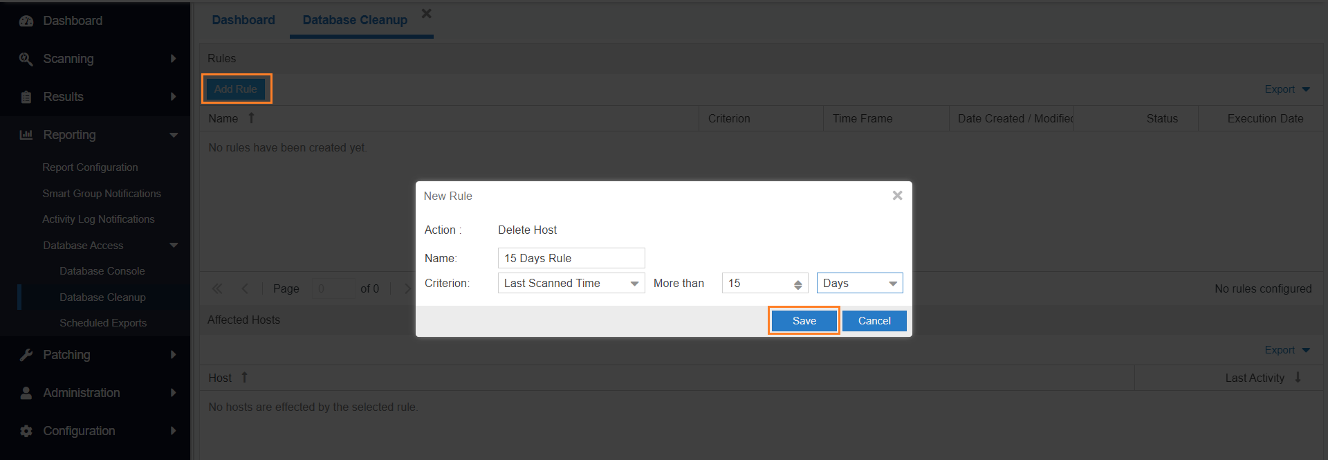 The rules can be based on Last Scan Time, Last Check-in Time or for Host that have been Never Scanned. Once a rule has been configured you can see which Affected Hosts meet the criteria defined in the rule and will be deleted from your Software Vulnerability Manager account.