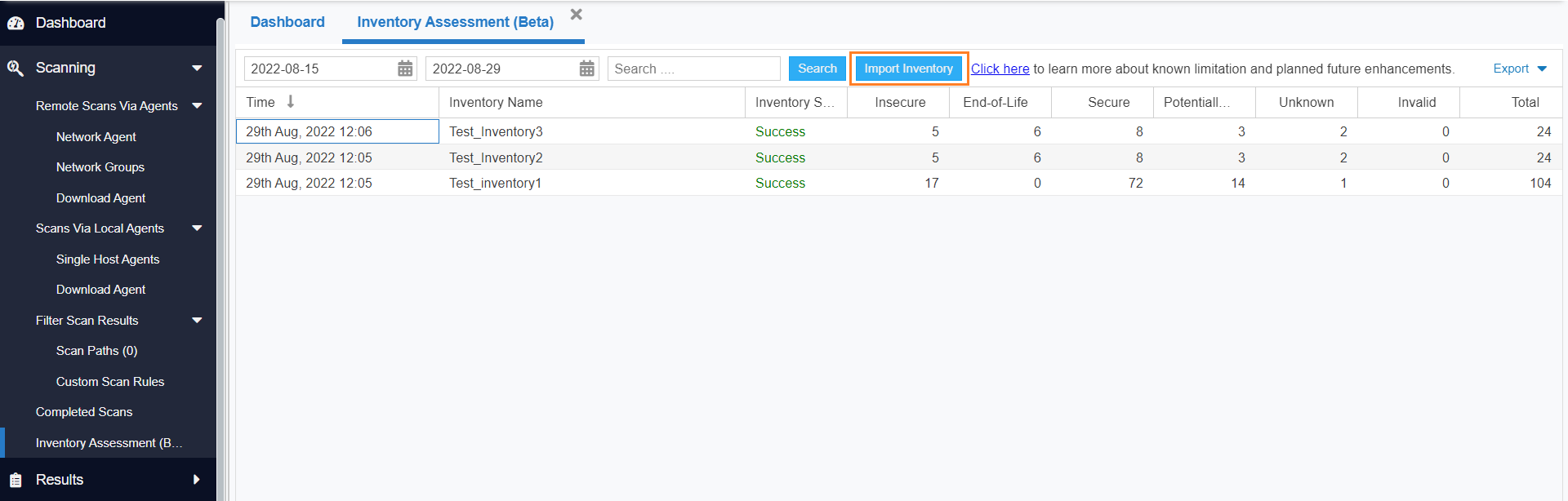 - Click Import Inventory in the Inventory Assessment (Beta) page.