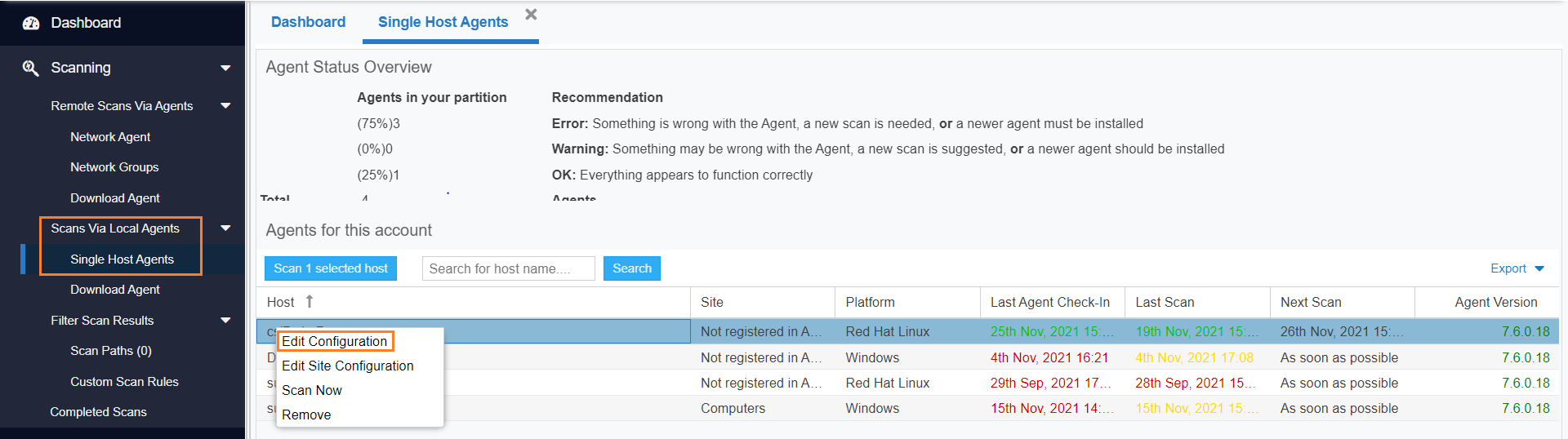 - Manage configurations and schedule scans for the hosts where the Agent is installed as a service in Single Host mode.