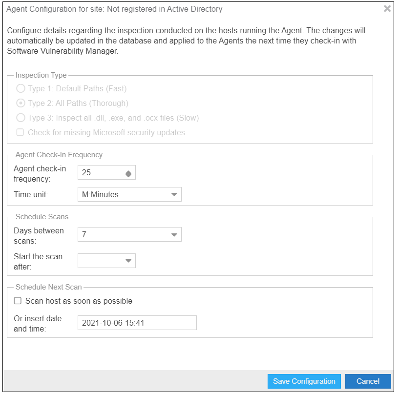 - The scan configuration settings set on the Software Vulnerability Manager website are not automatically transmitted to the agents. The agents have to connect to the Software Vulnerability Manager website as per their prior scheduled Agent Check-In Frequency before the agents become aware of the new scan configuration edits.